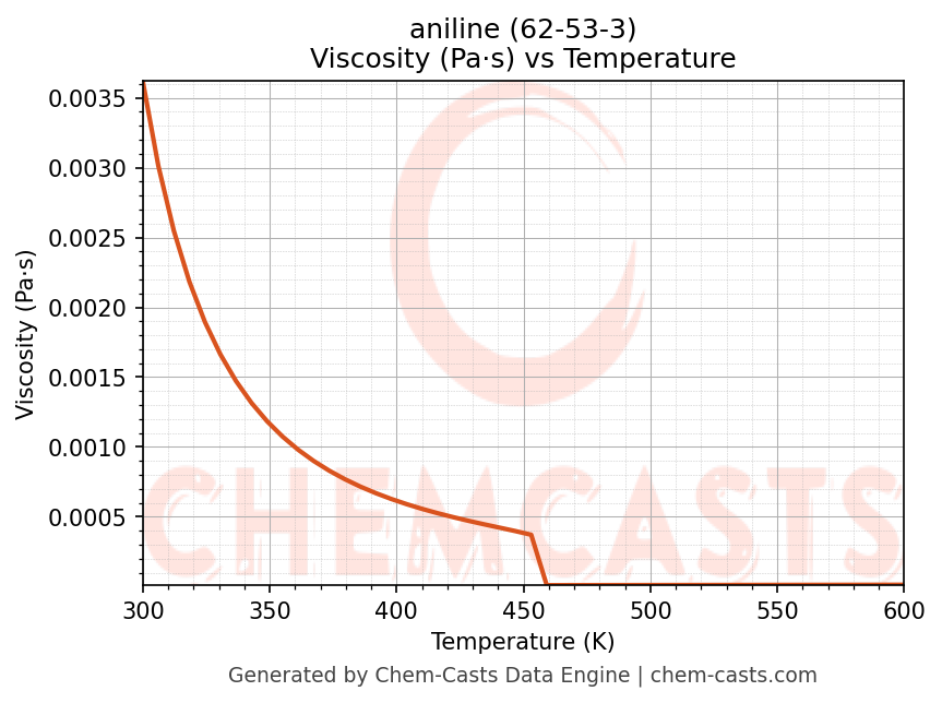 This page presents the temperature-dependent thermodynamic and transport properties of aniline (CAS 62-53-3) calculated at a constant pressure of 1 atm (101325 Pa) over the temperature range 250-500 K.