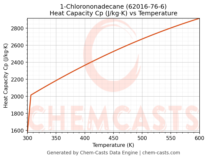 - Specific heat capacity (Cp) indicates the amount of energy required to raise the temperature of 1-Chlorononadecane and is critical for energy balance and heat-exchanger design.