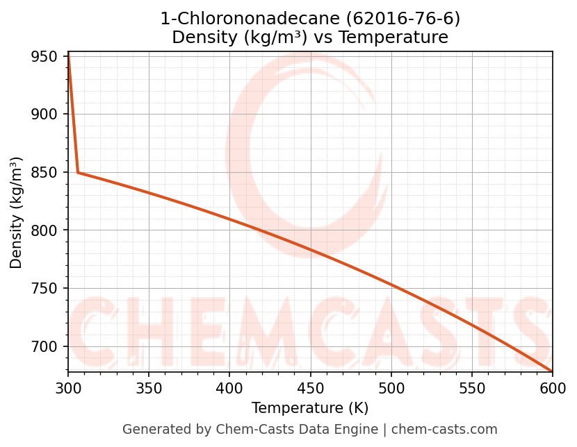 This page presents the temperature-dependent thermodynamic and transport properties of 1-Chlorononadecane (CAS 62016-76-6) calculated at a constant pressure of 1 atm (101325 Pa) over the temperature range 250-500 K.