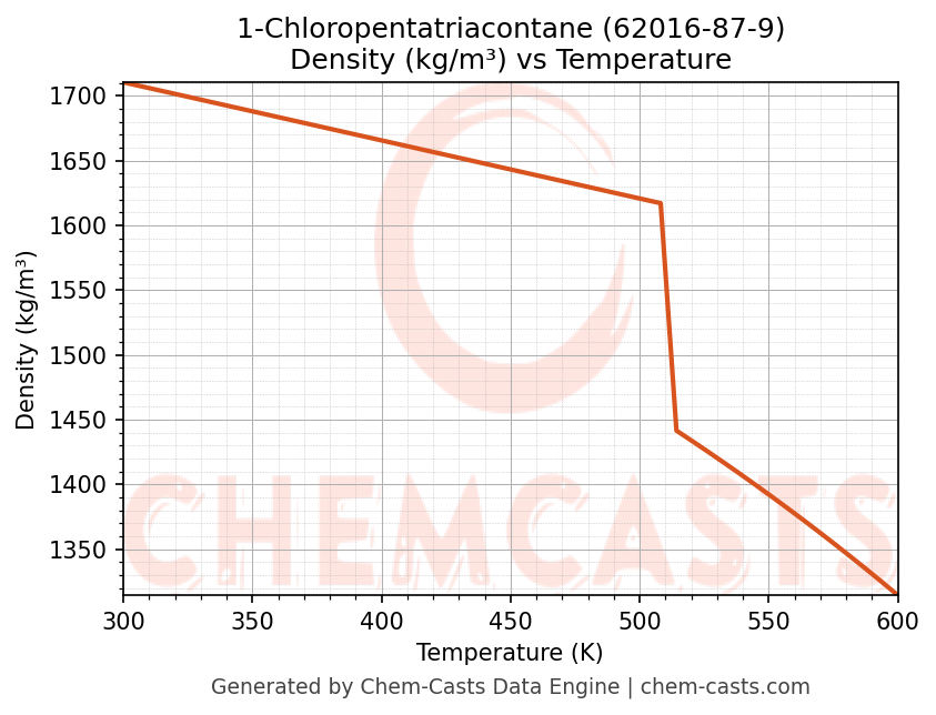 This page presents the temperature-dependent thermodynamic and transport properties of 1-Chloropentatriacontane (CAS 62016-87-9) calculated at a constant pressure of 1 atm (101325 Pa) over the temperature range 250-500 K.