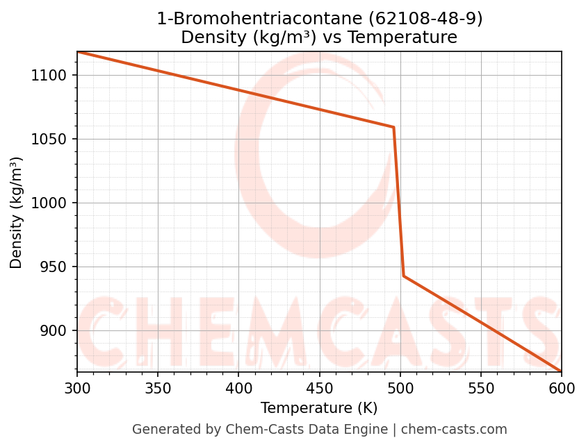 This page presents the temperature-dependent thermodynamic and transport properties of 1-Bromohentriacontane (CAS 62108-48-9) calculated at a constant pressure of 1 atm (101325 Pa) over the temperature range 250-500 K.