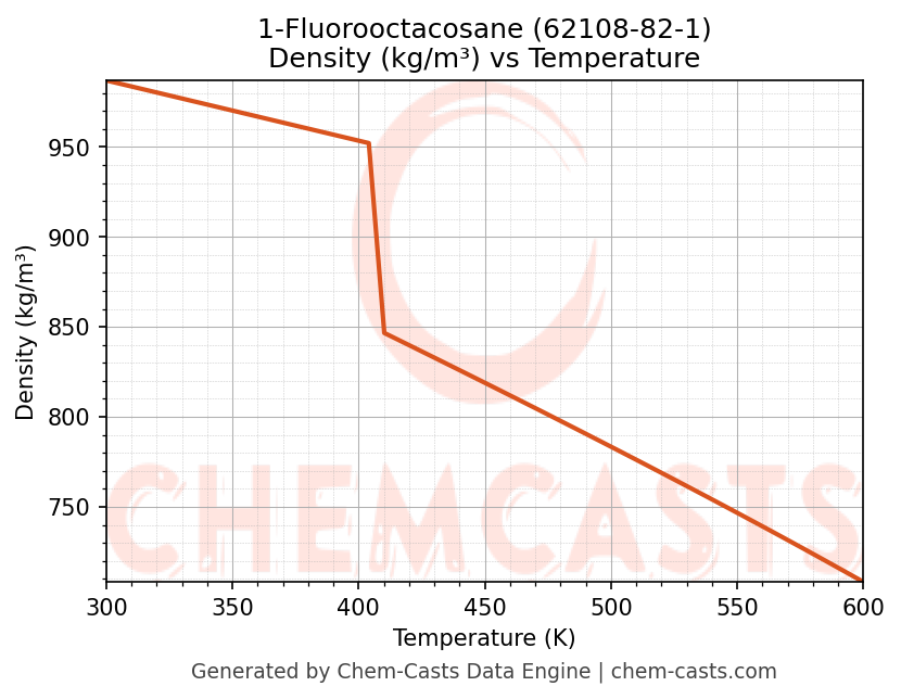 This page presents the temperature-dependent thermodynamic and transport properties of 1-Fluorooctacosane (CAS 62108-82-1) calculated at a constant pressure of 1 atm (101325 Pa) over the temperature range 250-500 K.