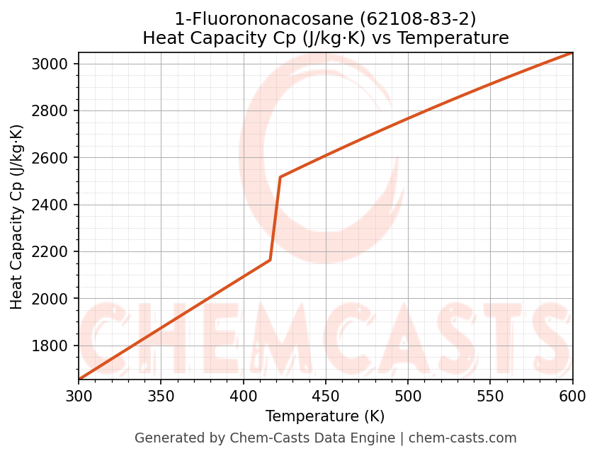 - Specific heat capacity (Cp) indicates the amount of energy required to raise the temperature of 1-Fluorononacosane and is critical for energy balance and heat-exchanger design.