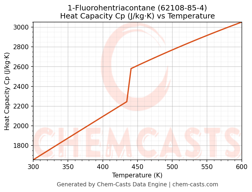 - Specific heat capacity (Cp) indicates the amount of energy required to raise the temperature of 1-Fluorohentriacontane and is critical for energy balance and heat-exchanger design.