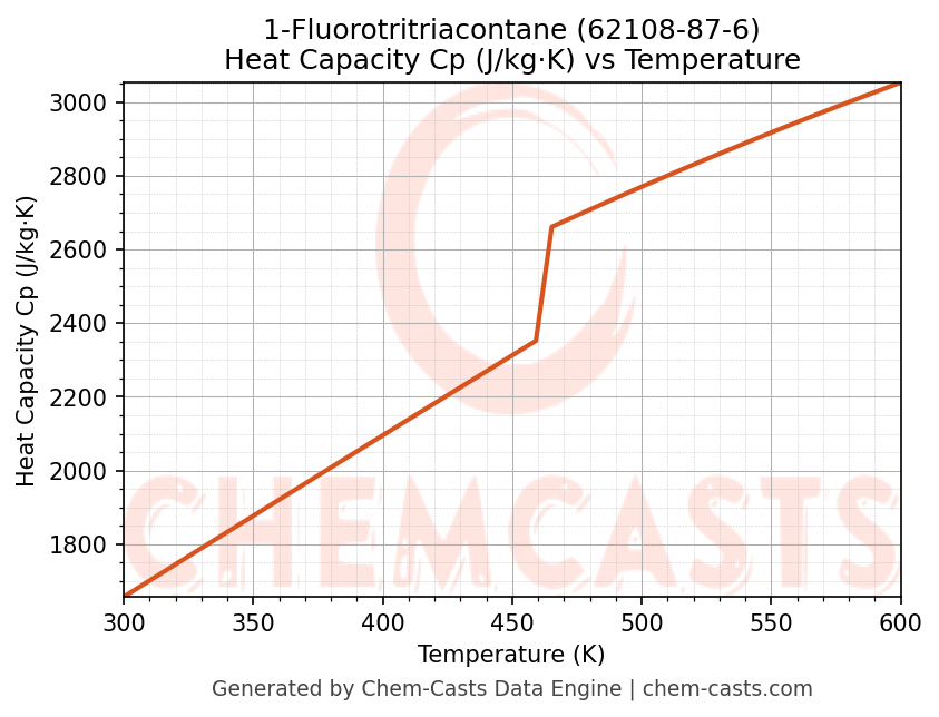 - Specific heat capacity (Cp) indicates the amount of energy required to raise the temperature of 1-Fluorotritriacontane and is critical for energy balance and heat-exchanger design.