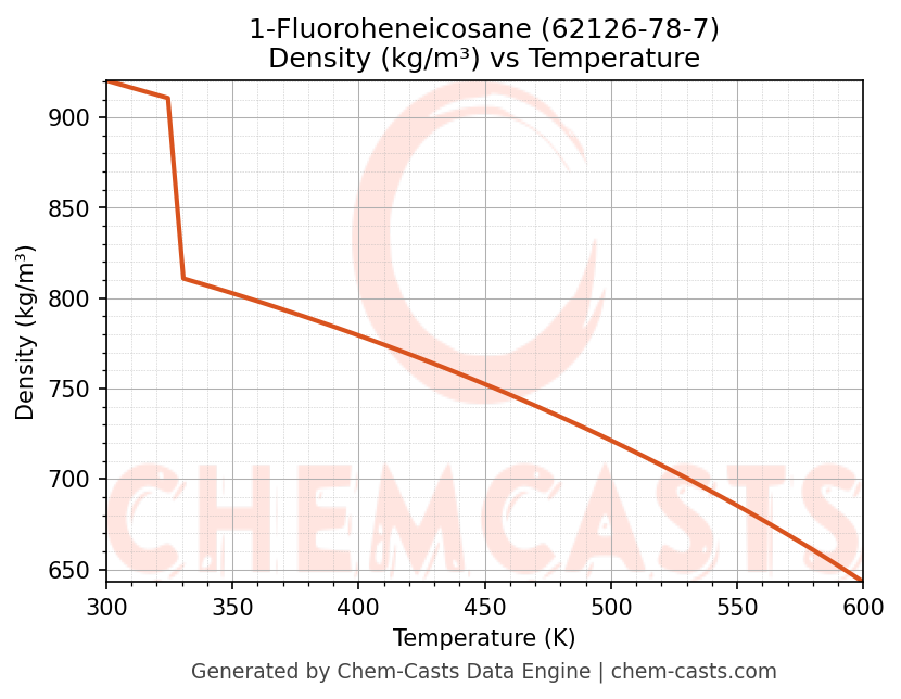 This page presents the temperature-dependent thermodynamic and transport properties of 1-Fluoroheneicosane (CAS 62126-78-7) calculated at a constant pressure of 1 atm (101325 Pa) over the temperature range 250-500 K.