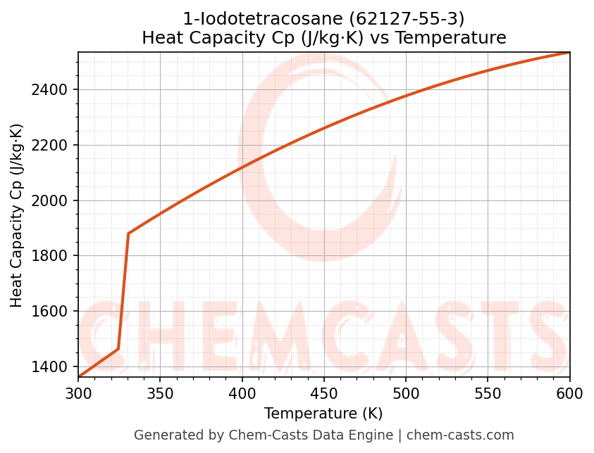 - Specific heat capacity (Cp) indicates the amount of energy required to raise the temperature of 1-Iodotetracosane and is critical for energy balance and heat-exchanger design.