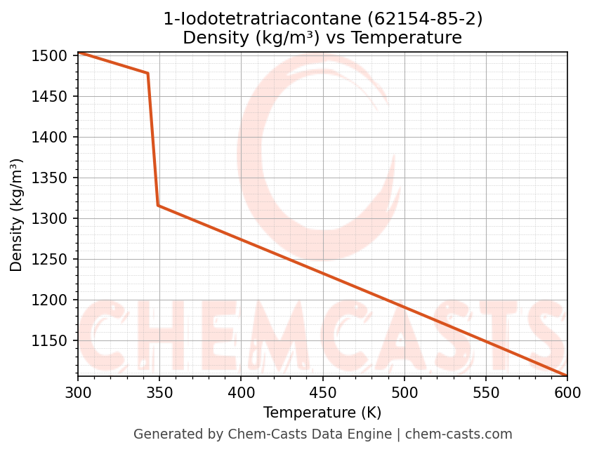 This page presents the temperature-dependent thermodynamic and transport properties of 1-Iodotetratriacontane (CAS 62154-85-2) calculated at a constant pressure of 1 atm (101325 Pa) over the temperature range 250-500 K.