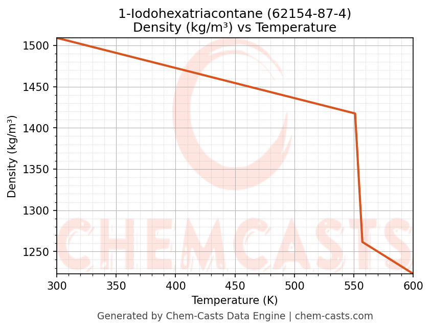 This page presents the temperature-dependent thermodynamic and transport properties of 1-Iodohexatriacontane (CAS 62154-87-4) calculated at a constant pressure of 1 atm (101325 Pa) over the temperature range 250-500 K.