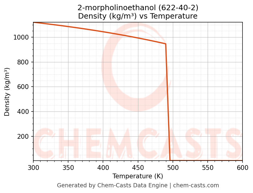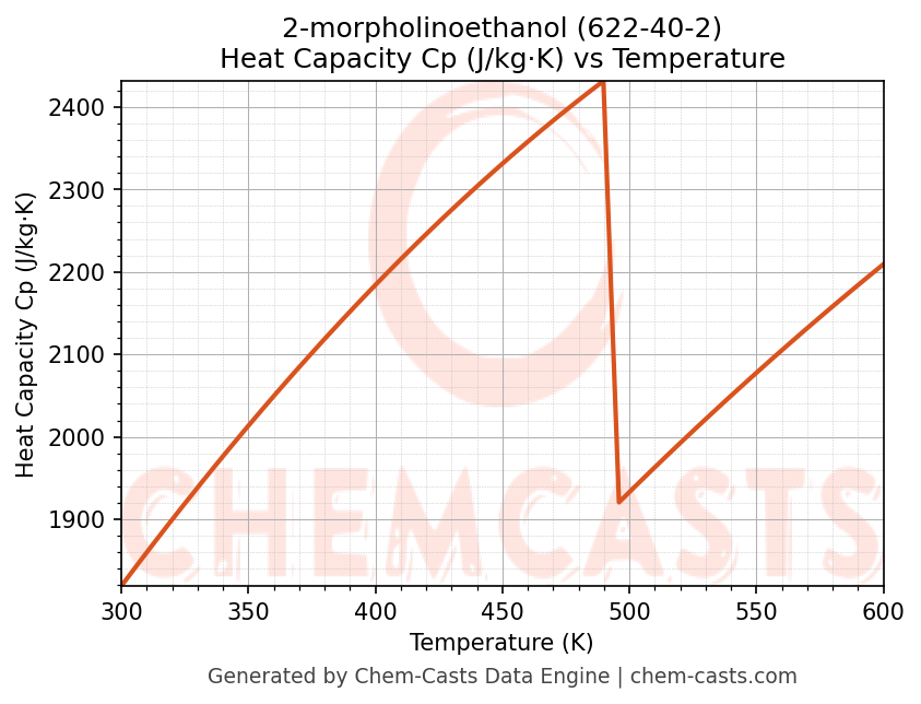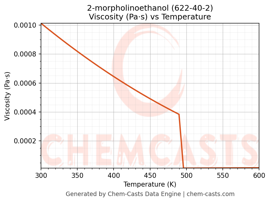 This page presents the temperature-dependent thermodynamic and transport properties of 2-morpholinoethanol (CAS 622-40-2) calculated at a constant pressure of 1 atm (101325 Pa) over the temperature range 250-500 K.