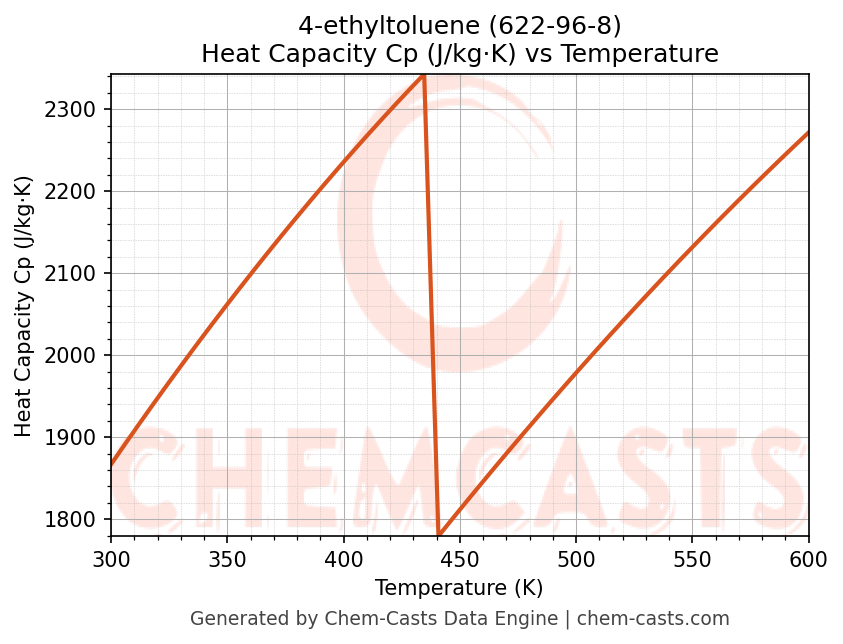 - Specific heat capacity (Cp) indicates the amount of energy required to raise the temperature of 4-ethyltoluene and is critical for energy balance and heat-exchanger design.