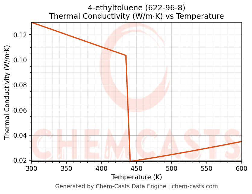 This page presents the temperature-dependent thermodynamic and transport properties of 4-ethyltoluene (CAS 622-96-8) calculated at a constant pressure of 1 atm (101325 Pa) over the temperature range 250-500 K.
