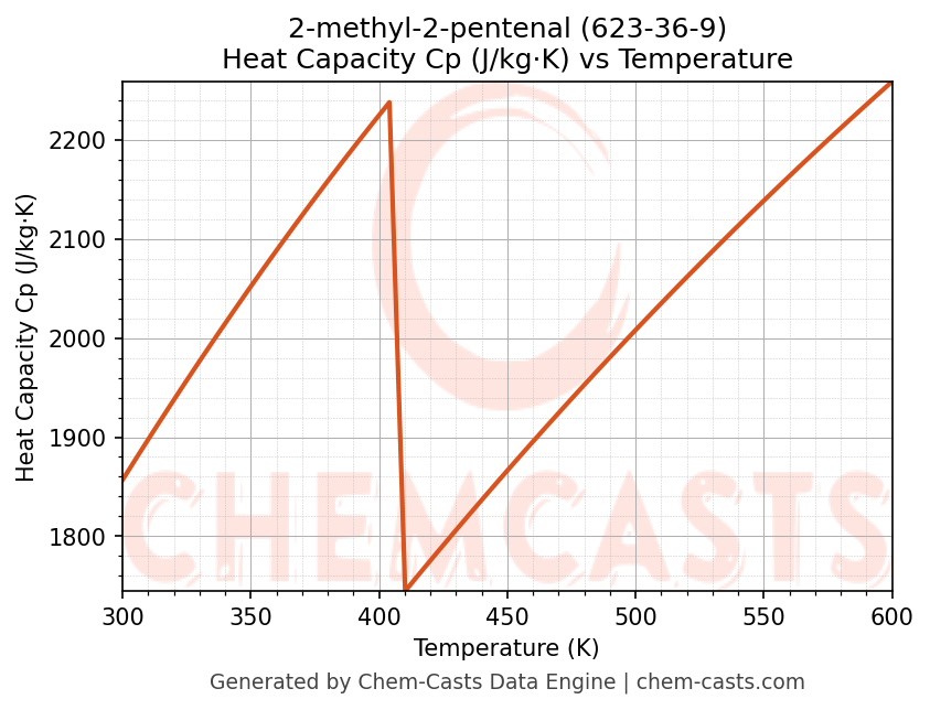 - Specific heat capacity (Cp) indicates the amount of energy required to raise the temperature of 2-methyl-2-pentenal and is critical for energy balance and heat-exchanger design.