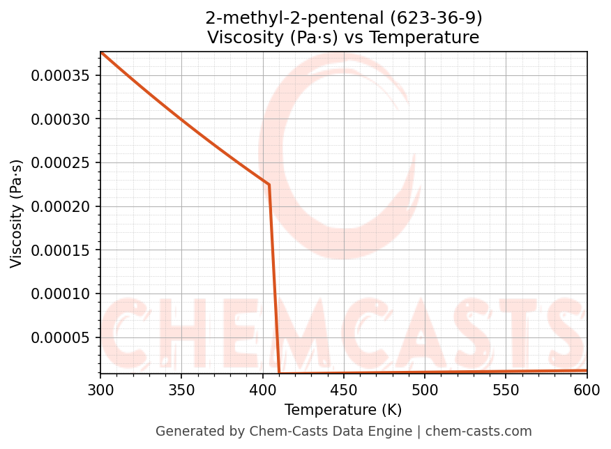 This page presents the temperature-dependent thermodynamic and transport properties of 2-methyl-2-pentenal (CAS 623-36-9) calculated at a constant pressure of 1 atm (101325 Pa) over the temperature range 250-500 K.