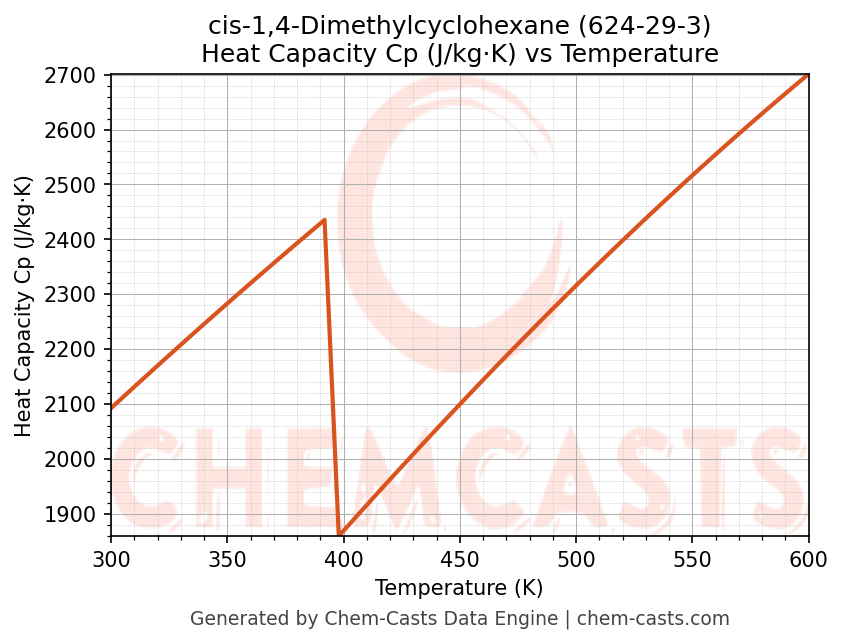 - Specific heat capacity (Cp) indicates the amount of energy required to raise the temperature of cis-1,4-Dimethylcyclohexane and is critical for energy balance and heat-exchanger design.