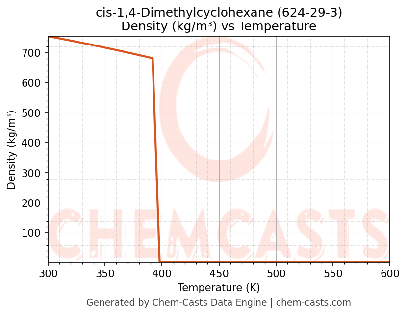 This page presents the temperature-dependent thermodynamic and transport properties of cis-1,4-Dimethylcyclohexane (CAS 624-29-3) calculated at a constant pressure of 1 atm (101325 Pa) over the temperature range 250-500 K.