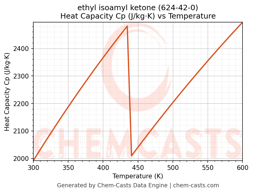This page presents the temperature-dependent thermodynamic and transport properties of ethyl isoamyl ketone (CAS 624-42-0) calculated at a constant pressure of 1 atm (101325 Pa) over the temperature range 250-500 K.
