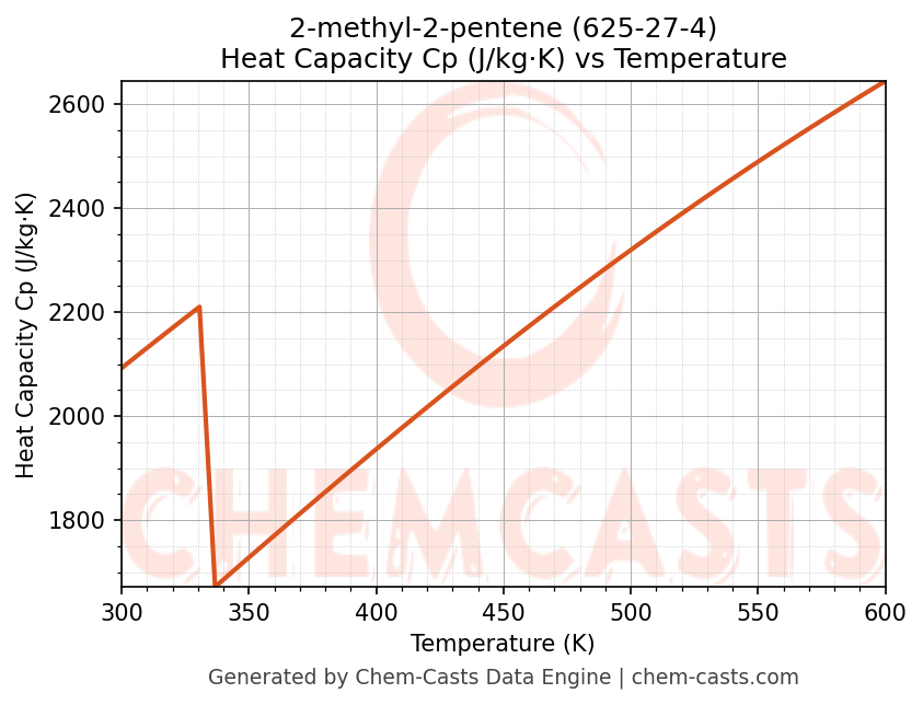 - Specific heat capacity (Cp) indicates the amount of energy required to raise the temperature of 2-methyl-2-pentene and is critical for energy balance and heat-exchanger design.