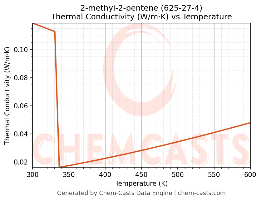 This page presents the temperature-dependent thermodynamic and transport properties of 2-methyl-2-pentene (CAS 625-27-4) calculated at a constant pressure of 1 atm (101325 Pa) over the temperature range 250-500 K.