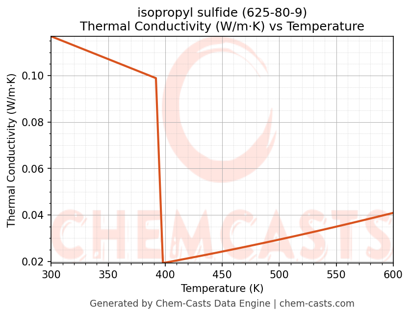 This page presents the temperature-dependent thermodynamic and transport properties of isopropyl sulfide (CAS 625-80-9) calculated at a constant pressure of 1 atm (101325 Pa) over the temperature range 250-500 K.