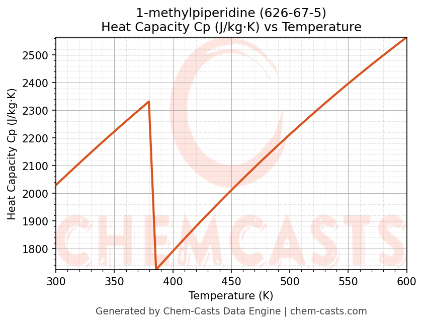 - Specific heat capacity (Cp) indicates the amount of energy required to raise the temperature of 1-methylpiperidine and is critical for energy balance and heat-exchanger design.