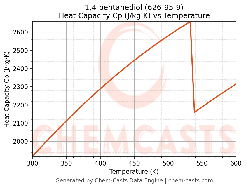 - Specific heat capacity (Cp) indicates the amount of energy required to raise the temperature of 1,4-pentanediol and is critical for energy balance and heat-exchanger design.