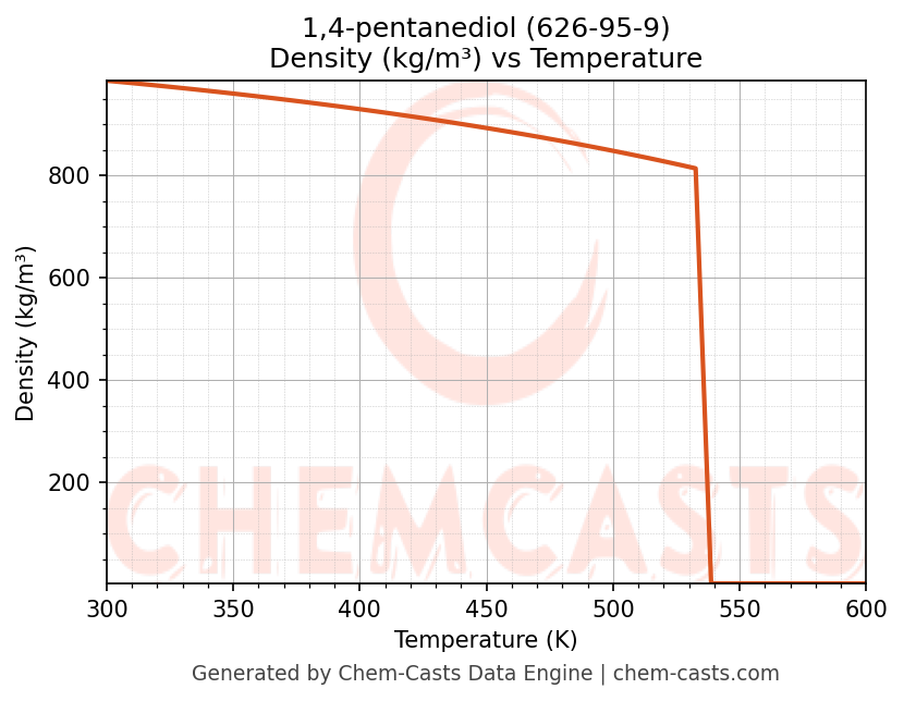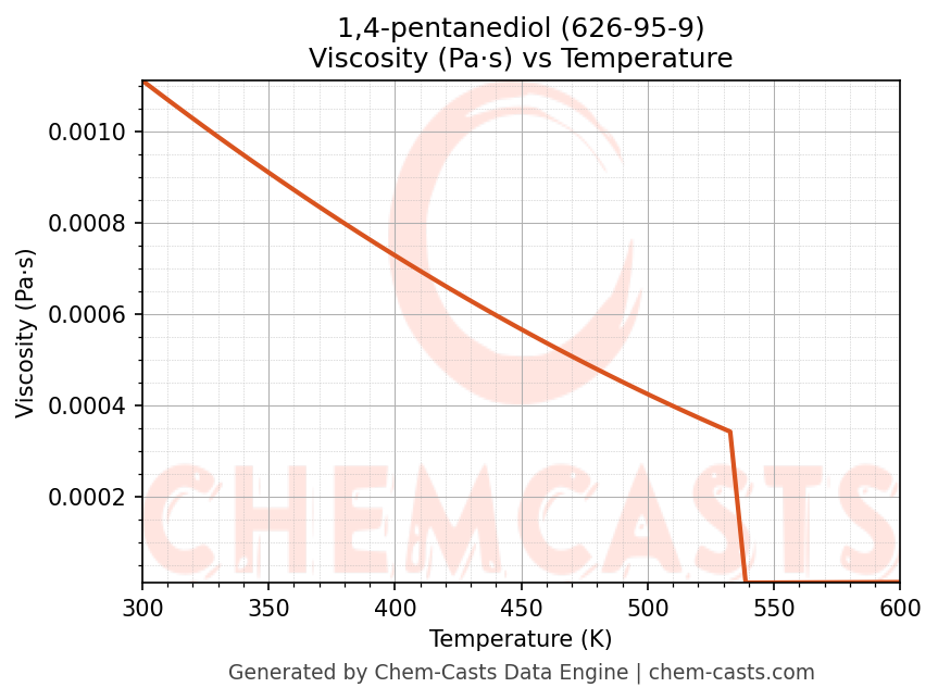 This page presents the temperature-dependent thermodynamic and transport properties of 1,4-pentanediol (CAS 626-95-9) calculated at a constant pressure of 1 atm (101325 Pa) over the temperature range 250-500 K.