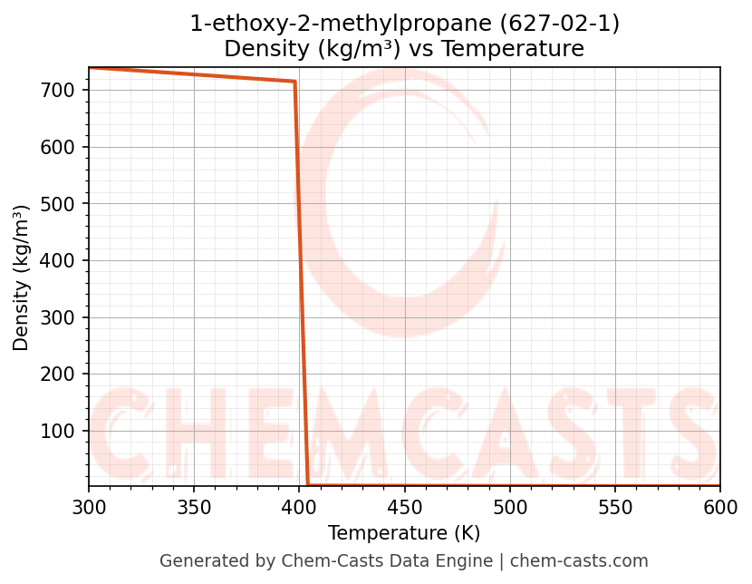 This page presents the temperature-dependent thermodynamic and transport properties of 1-ethoxy-2-methylpropane (CAS 627-02-1) calculated at a constant pressure of 1 atm (101325 Pa) over the temperature range 250-500 K.
