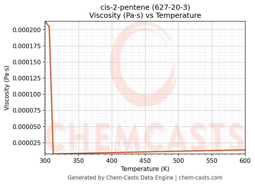 This page presents the temperature-dependent thermodynamic and transport properties of cis-2-pentene (CAS 627-20-3) calculated at a constant pressure of 1 atm (101325 Pa) over the temperature range 250-500 K.