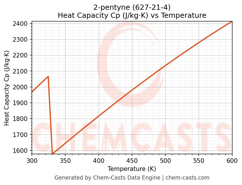 - Specific heat capacity (Cp) indicates the amount of energy required to raise the temperature of 2-pentyne and is critical for energy balance and heat-exchanger design.