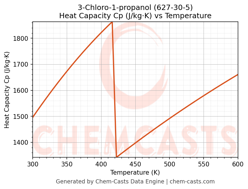 - Specific heat capacity (Cp) indicates the amount of energy required to raise the temperature of 3-Chloro-1-propanol and is critical for energy balance and heat-exchanger design.