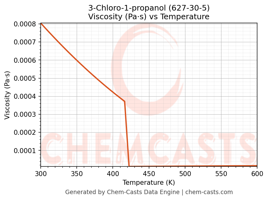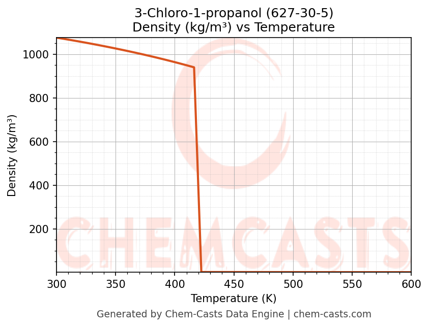 This page presents the temperature-dependent thermodynamic and transport properties of 3-Chloro-1-propanol (CAS 627-30-5) calculated at a constant pressure of 1 atm (101325 Pa) over the temperature range 250-500 K.