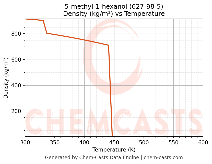 This page presents the temperature-dependent thermodynamic and transport properties of 5-methyl-1-hexanol (CAS 627-98-5) calculated at a constant pressure of 1 atm (101325 Pa) over the temperature range 250-500 K.