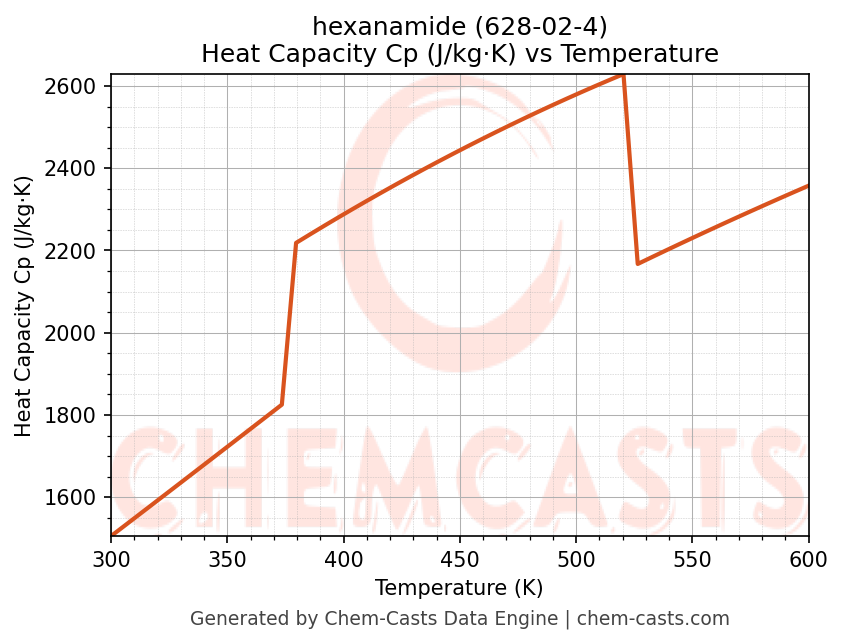 - Specific heat capacity (Cp) indicates the amount of energy required to raise the temperature of hexanamide and is critical for energy balance and heat-exchanger design.