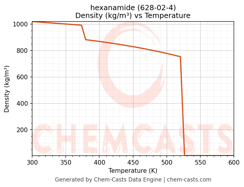 This page presents the temperature-dependent thermodynamic and transport properties of hexanamide (CAS 628-02-4) calculated at a constant pressure of 1 atm (101325 Pa) over the temperature range 250-500 K.