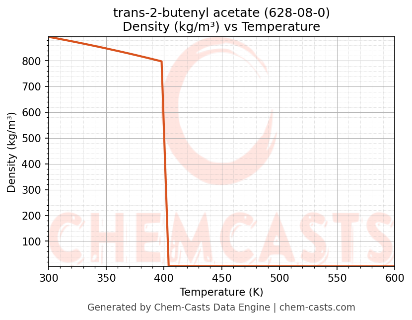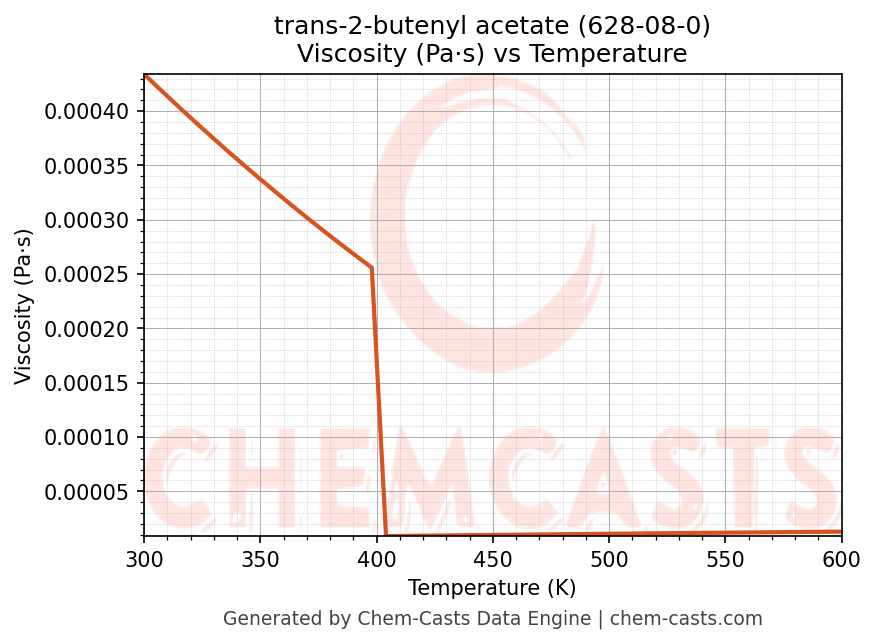 This page presents the temperature-dependent thermodynamic and transport properties of trans-2-butenyl acetate (CAS 628-08-0) calculated at a constant pressure of 1 atm (101325 Pa) over the temperature range 250-500 K.