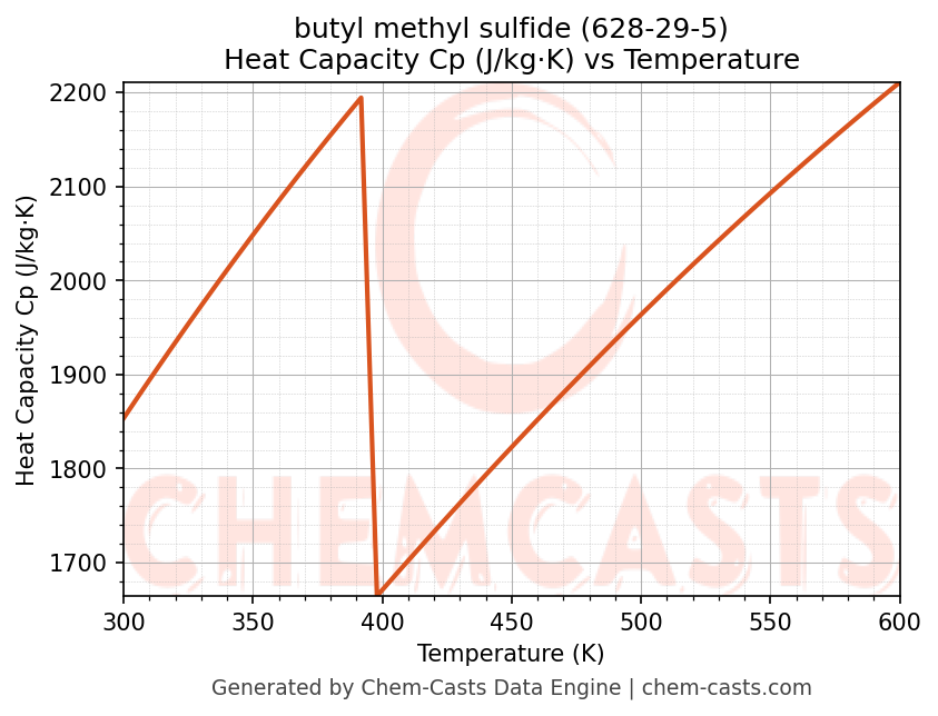 - Specific heat capacity (Cp) indicates the amount of energy required to raise the temperature of butyl methyl sulfide and is critical for energy balance and heat-exchanger design.