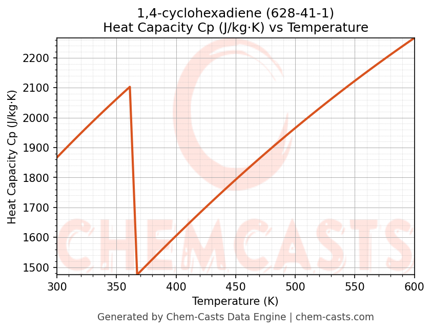 - Specific heat capacity (Cp) indicates the amount of energy required to raise the temperature of 1,4-cyclohexadiene and is critical for energy balance and heat-exchanger design.