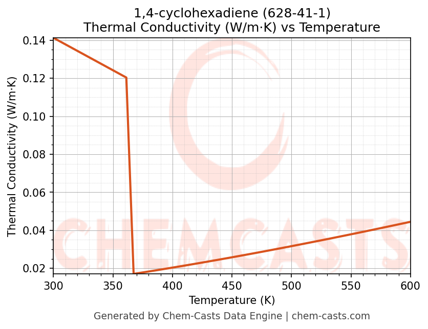 This page presents the temperature-dependent thermodynamic and transport properties of 1,4-cyclohexadiene (CAS 628-41-1) calculated at a constant pressure of 1 atm (101325 Pa) over the temperature range 250-500 K.