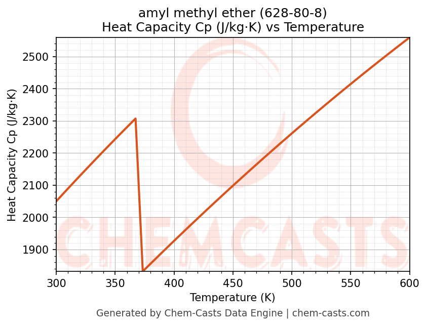 This page presents the temperature-dependent thermodynamic and transport properties of amyl methyl ether (CAS 628-80-8) calculated at a constant pressure of 1 atm (101325 Pa) over the temperature range 250-500 K.