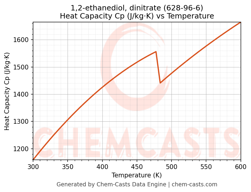 - Specific heat capacity (Cp) indicates the amount of energy required to raise the temperature of 1,2-ethanediol, dinitrate and is critical for energy balance and heat-exchanger design.