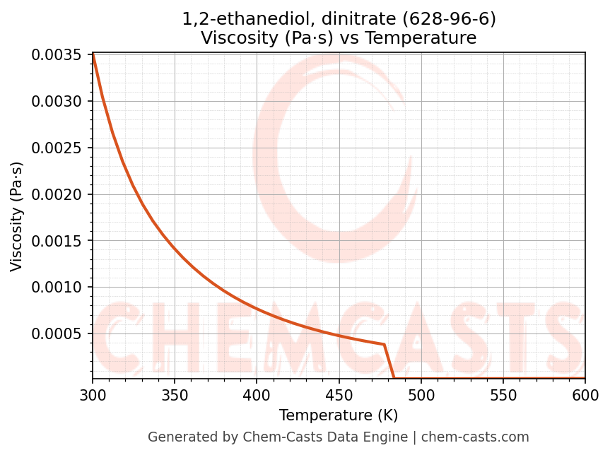 This page presents the temperature-dependent thermodynamic and transport properties of 1,2-ethanediol, dinitrate (CAS 628-96-6) calculated at a constant pressure of 1 atm (101325 Pa) over the temperature range 250-500 K.