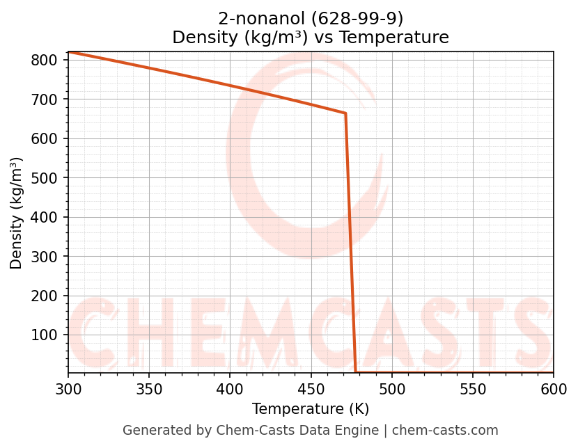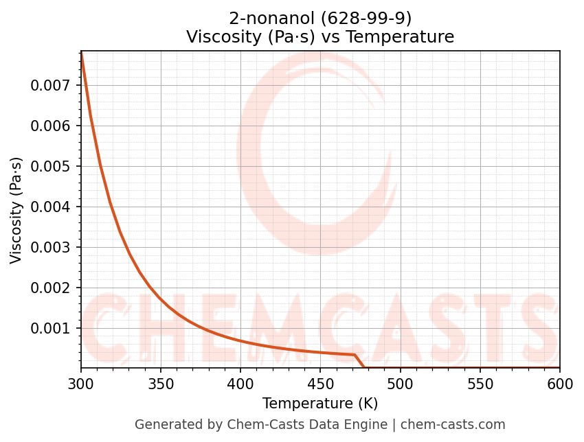 This page presents the temperature-dependent thermodynamic and transport properties of 2-nonanol (CAS 628-99-9) calculated at a constant pressure of 1 atm (101325 Pa) over the temperature range 250-500 K.