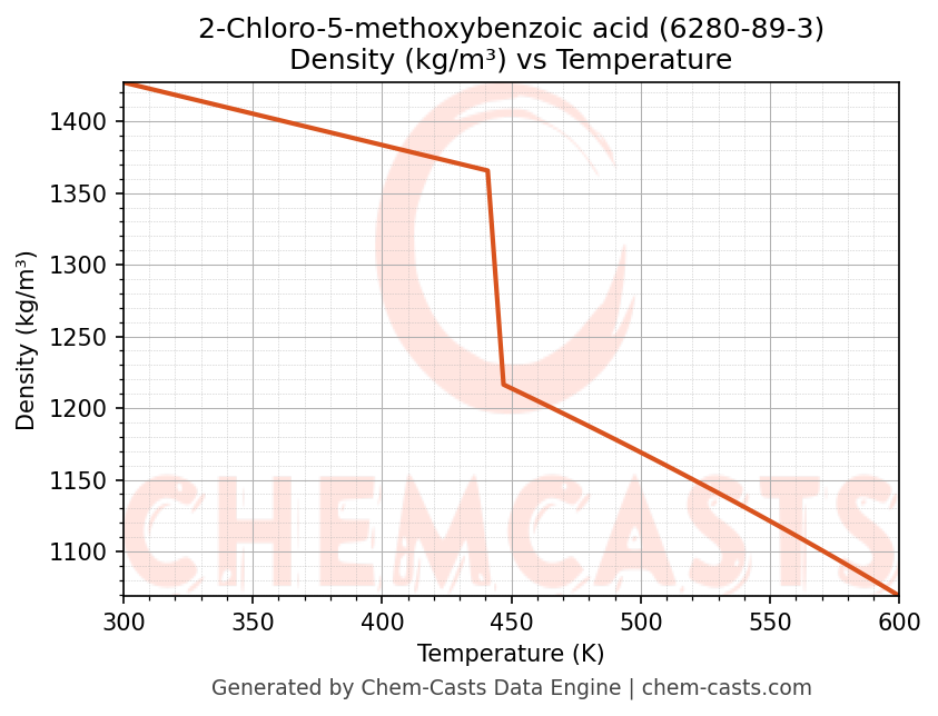 This page presents the temperature-dependent thermodynamic and transport properties of 2-Chloro-5-methoxybenzoic acid (CAS 6280-89-3) calculated at a constant pressure of 1 atm (101325 Pa) over the temperature range 250-500 K.