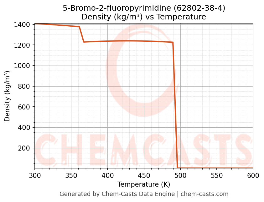 This page presents the temperature-dependent thermodynamic and transport properties of 5-Bromo-2-fluoropyrimidine (CAS 62802-38-4) calculated at a constant pressure of 1 atm (101325 Pa) over the temperature range 250-500 K.
