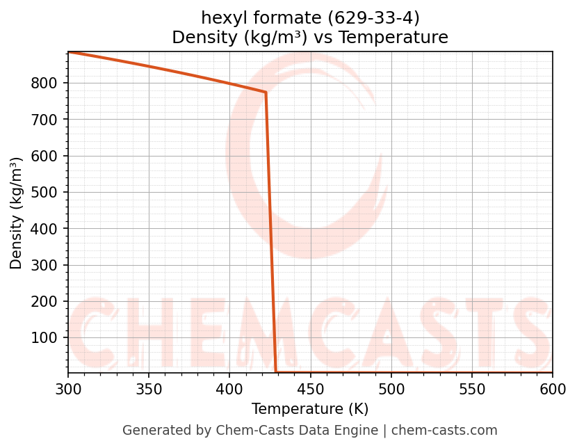 This page presents the temperature-dependent thermodynamic and transport properties of hexyl formate (CAS 629-33-4) calculated at a constant pressure of 1 atm (101325 Pa) over the temperature range 250-500 K.