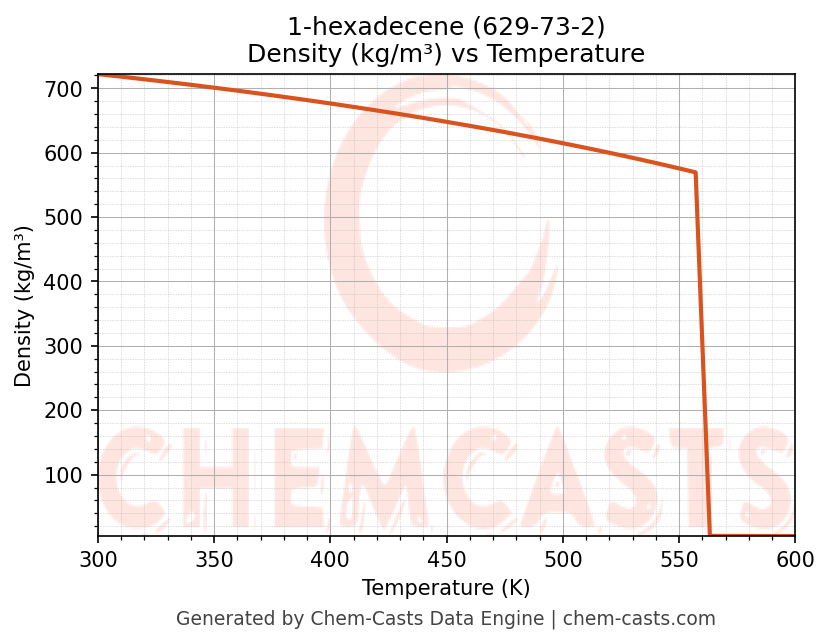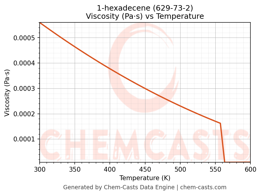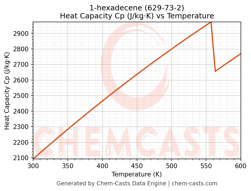 - Specific heat capacity (Cp) indicates the amount of energy required to raise the temperature of 1-hexadecene and is critical for energy balance and heat-exchanger design.