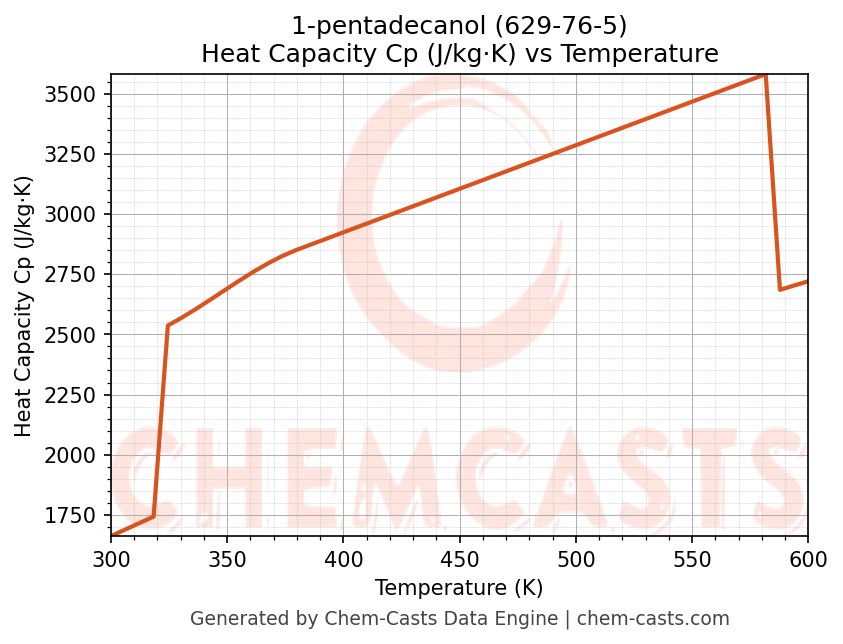 - Specific heat capacity (Cp) indicates the amount of energy required to raise the temperature of 1-pentadecanol and is critical for energy balance and heat-exchanger design.