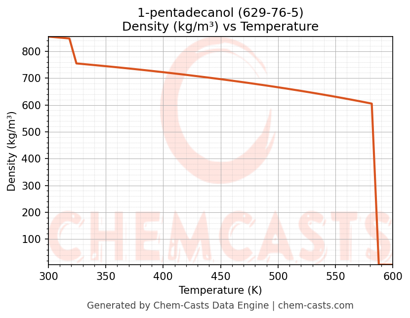 This page presents the temperature-dependent thermodynamic and transport properties of 1-pentadecanol (CAS 629-76-5) calculated at a constant pressure of 1 atm (101325 Pa) over the temperature range 250-500 K.