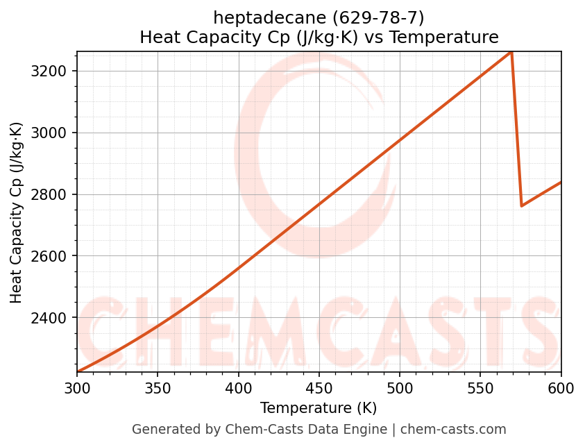 - Specific heat capacity (Cp) indicates the amount of energy required to raise the temperature of heptadecane and is critical for energy balance and heat-exchanger design.